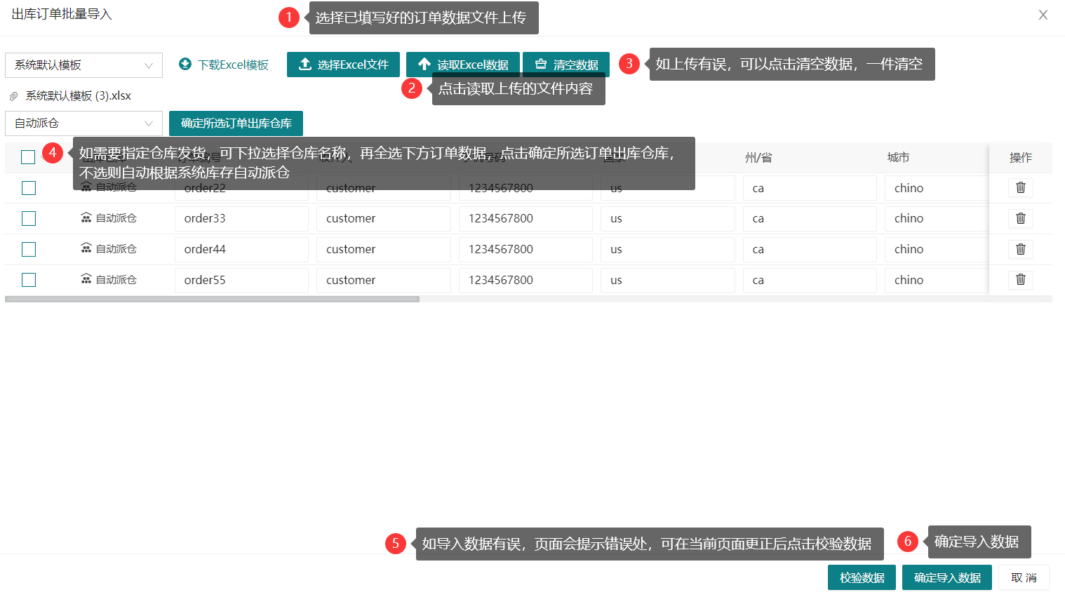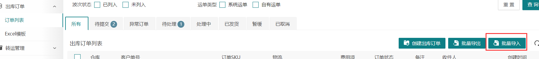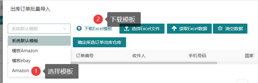 3.模板创建成功后可回到出库订单——订单列表——批量导入,选择对应的模板,导入订单即可,务必保证选择的模板和导入的订单数据格式一致,否则导入不成功。