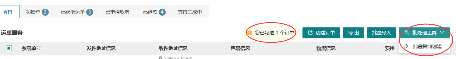六、如需以某个历史订单信息继续创建购买新的运单,可勾选此订单后点击复制创建